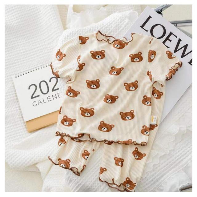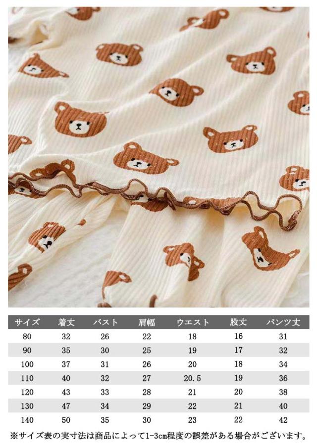 | 80cm 90cm 100cm 110cm 120cm 130cm 上下セット熊柄+上下セット花柄 薄手で涼しい生地が爽やかで心地よいパジャマです。 襟先、裾、袖口にあしらったメロウフリルがガーリーな雰囲気を引き立てます。 パジャマ、ルームウェア、ナイトウェア、寝間着、お休みの時の部屋着としても最適です。 | |