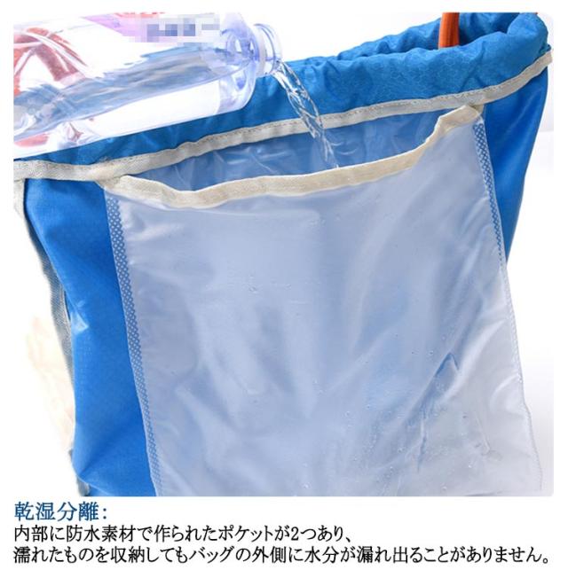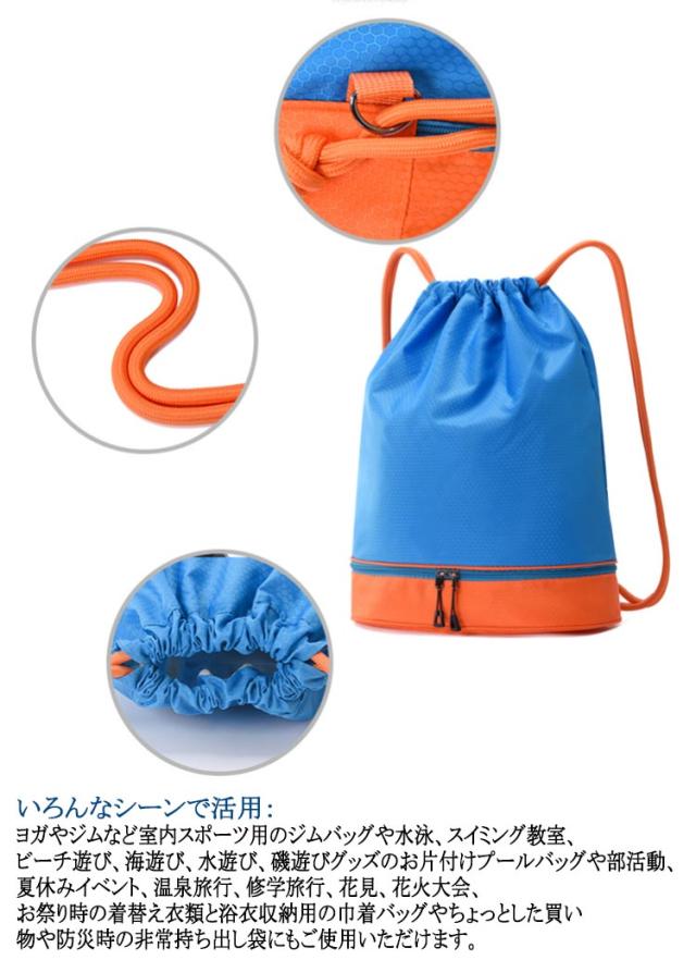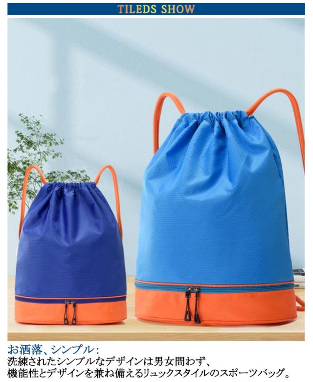 | 洗練されたシンプルなデザインは男女問わず、機能性とデザインを兼ね備えるリュックスタイルのスポーツバッグ。 乾湿分離:内部に防水素材で作られたポケットが2つあり、濡れたものを収納してもバッグの外側に水分が漏れ出ることがありません。 軽量&大容量:書類やタブレットも入る大容量。お出かけや部活の必要品がたっぷりに収納できます。 撥水加工:プール、ビーチや雨天などでも安心に!水と汗の侵入を防止し、濡らされる心配もいりません。 お洒落、シンプル:洗練されたシンプルなデザインは男女問わず、機能性とデザインを兼ね備えるリュックスタイルのスポーツバッグ。 いろんなシーンで活用:ヨガやジムなど室内スポーツ用のジムバッグや水泳、スイミング教室、ビーチ遊び、海遊び、水遊び、磯遊びグッズのお片付けプールバッグや部活動、夏休みイベント、温泉旅行、修学旅行、花見、花火大会、お祭り時の着替え衣類と浴衣収納用の巾着バッグやちょっとした買い物や防災時の非常持ち出し袋にもご使用いただけます。 | |