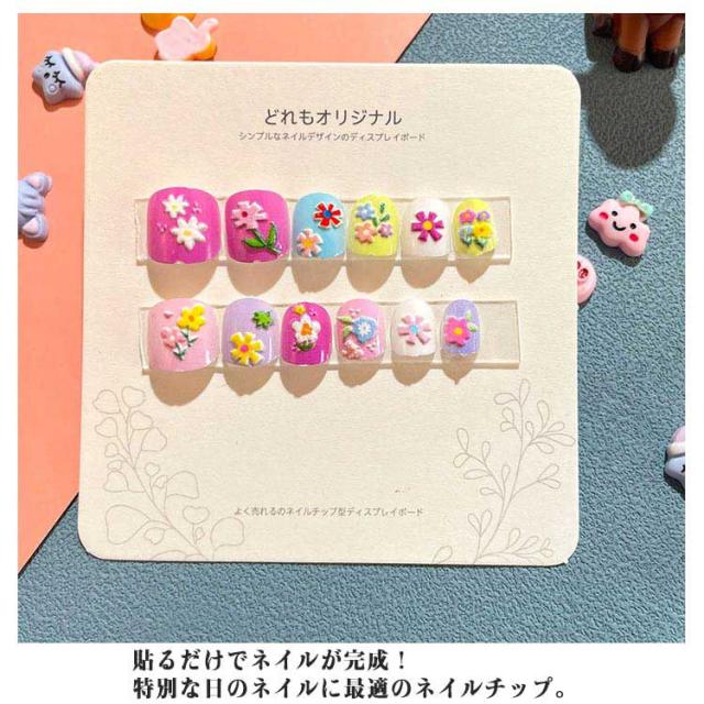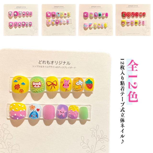 | 12枚入り粘着テープ式立体ネイル♪ お洒落キッズが大好きなネイル♪子供たちのDIYに最適です。 貼るだけでネイルが完成! 特別な日のネイルに最適のネイルチップ。 こちらは子供用ですが指の小さい方なら大人でもご使用可能です。 | |