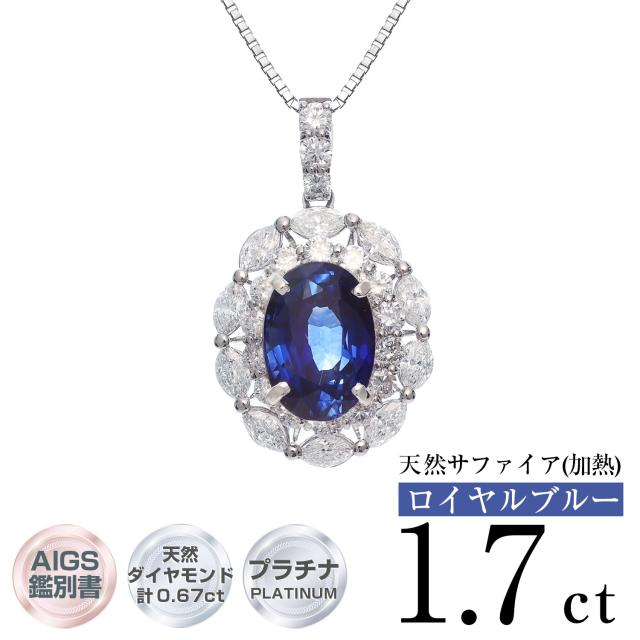 PT 天然サファイア 1.70ct ロイヤルブルー/加熱 天然ダイヤモンド 計0.67ct オーバルペンダント AIGS鑑別書付