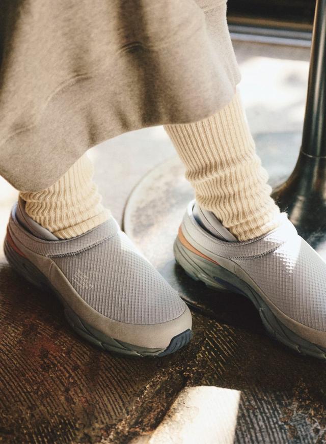 踵は踏んでも履けるストレッチ素材だから、脱ぎ履きも簡単だ。