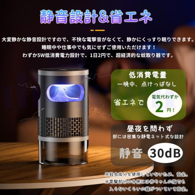 光で虫を引き寄せ、電撃ショックで撃退する電撃殺虫器です。いや?な蚊・ハエ・毒蛾を駆除し、快適にお過ごしいただけます。一切な薬剤を使わないので、稼働中に臭いや煙や有害な化学物質なども出ません、物理的に害虫を退治できます、妊婦や赤ちゃんやペットにもがいる家庭にも安心してご利用いただけます。従来の蚊取り線香や化学薬品を使わないので、臭いが発生せず、無毒で安全です。電撃殺虫器で蚊、ハエ、毒蛾を駆除し、快適にお過ごしいただけます。この電撃殺虫器一台で蚊を360°吸引して捕獲します。害虫の好む光(波長360-400nm)で、市場の365nmより更に子バエ、蝿、蛾など虫を誘引し、アカイエカ、ヒトスジシマカ(ヤブカ)、チカイエカ、ネッタイシマカ、ショウジョウバエ、チョウバエ、イエバエなど色々なの羽虫に有効!シェルは絶縁性のABSプラスチック製で、高密度のシェルギャップは6mmであるため、指が高電圧ネットに誤って触れるのを効果的に防ぐことができます。妊婦さんと赤ちゃんと犬・猫などのペットがいるご家庭でも安心してお使いいただけます。