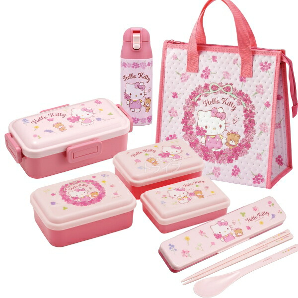ハローキティ フラワーリース お買得 5点セット 抗菌 4点ロックお弁当箱 コンビ 不織布 保冷バッグ シール容器3P 水筒360ml セット