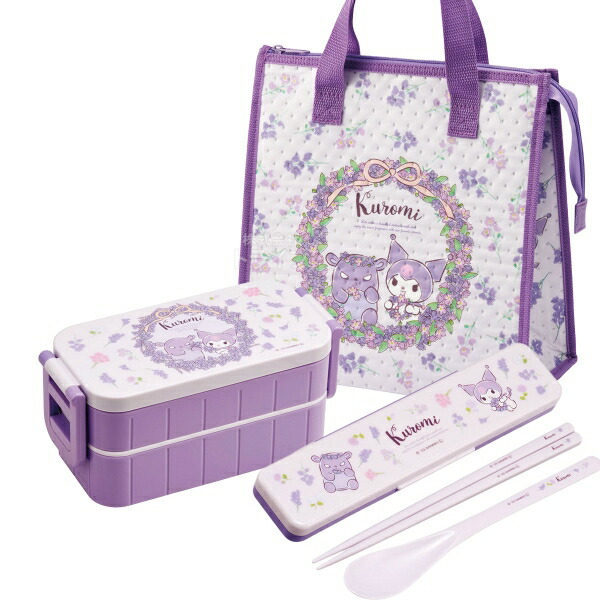 | クロミのお弁当箱セットです。2段ランチボックスはバッグに収納しやすいシンプルな形。中蓋に収納できるお箸も付いています。単品で買うよりもお買得なセットをこの機会に是非どうぞ! | |
