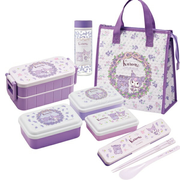 | クロミのお弁当箱セットです。2段ランチボックスはバッグに収納しやすいシンプルな形。中蓋に収納できるお箸も付いています。単品で買うよりもお買得なセットをこの機会に是非どうぞ! | |