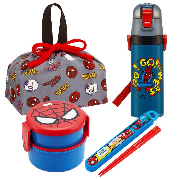 スパイダーマン お買得4点セット 丸型ランチボックス2段 フォーク付 箸&箸箱 巾着 水筒