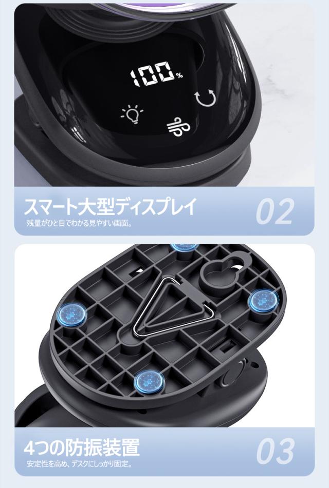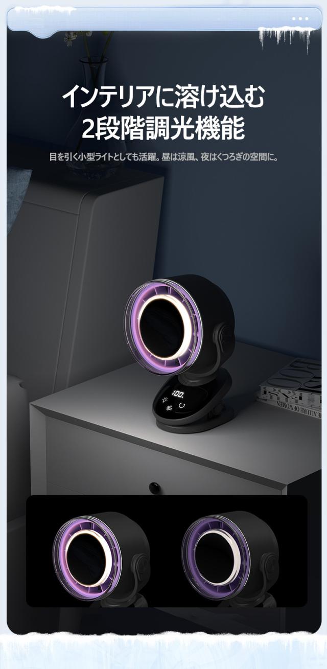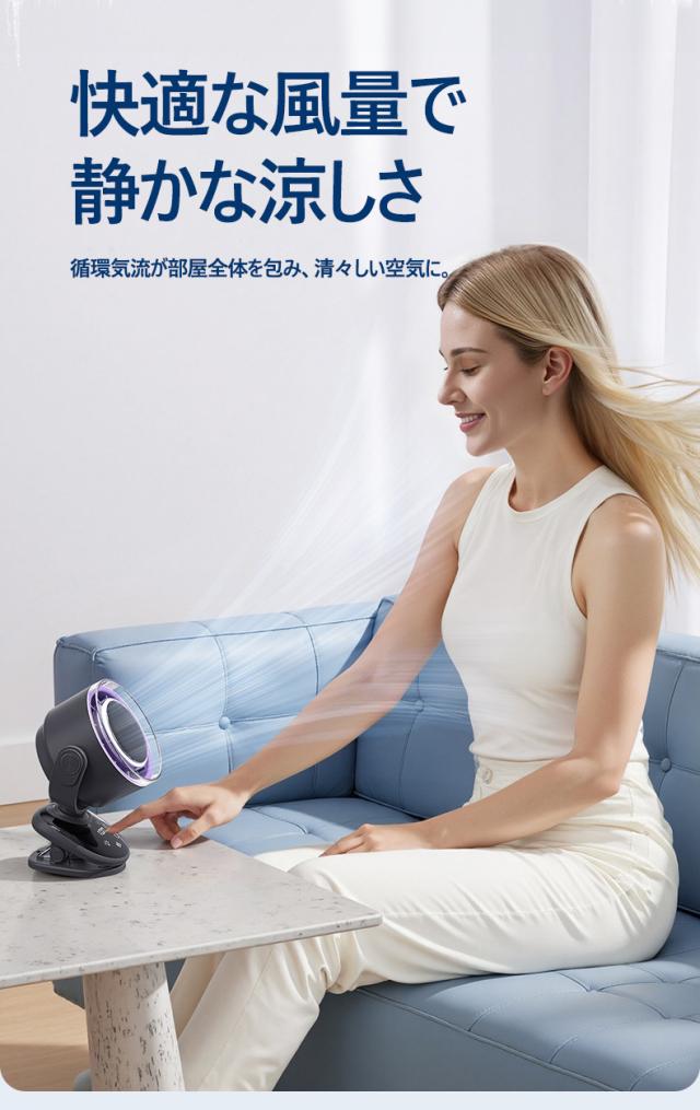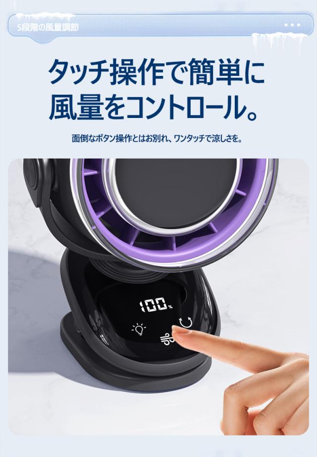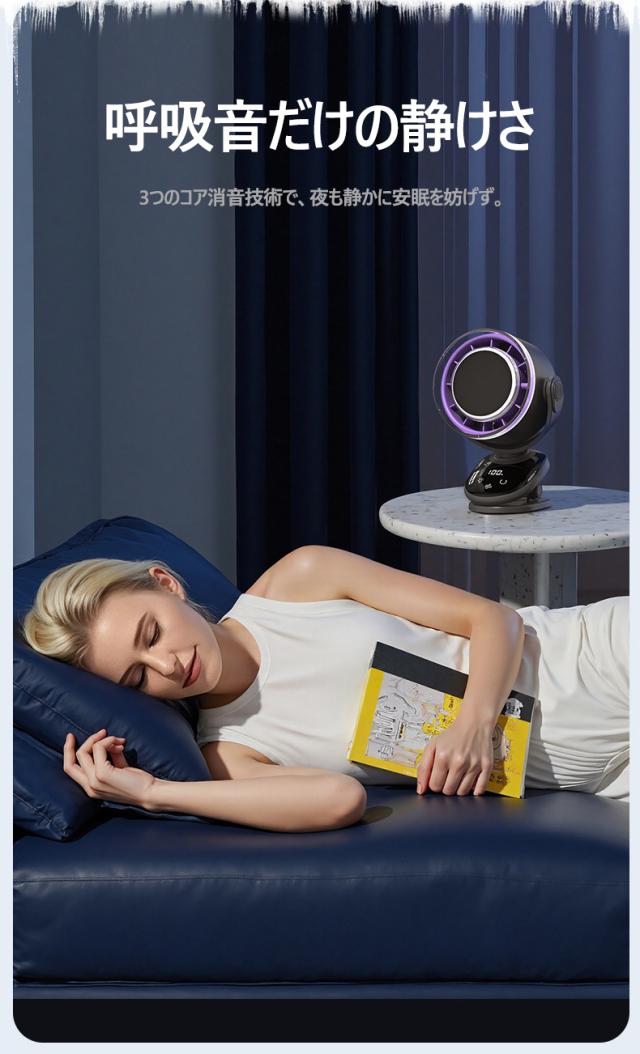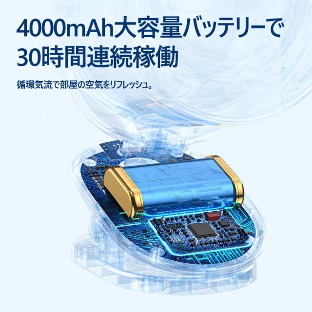 パワフルな風量と静音設計を兼ね備えた、小型ながら高性能なデスクファンです。4000mAhの大容量バッテリーを搭載し、コードレスで使用できるため、オフィスや自宅はもちろん、アウトドアやキャンプなどでも大活躍。