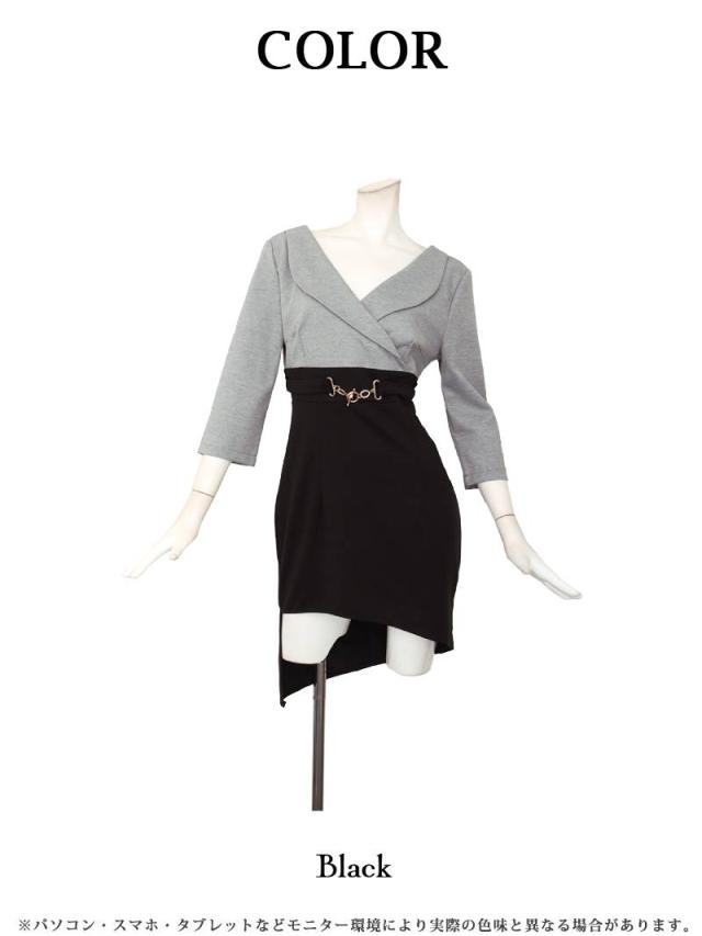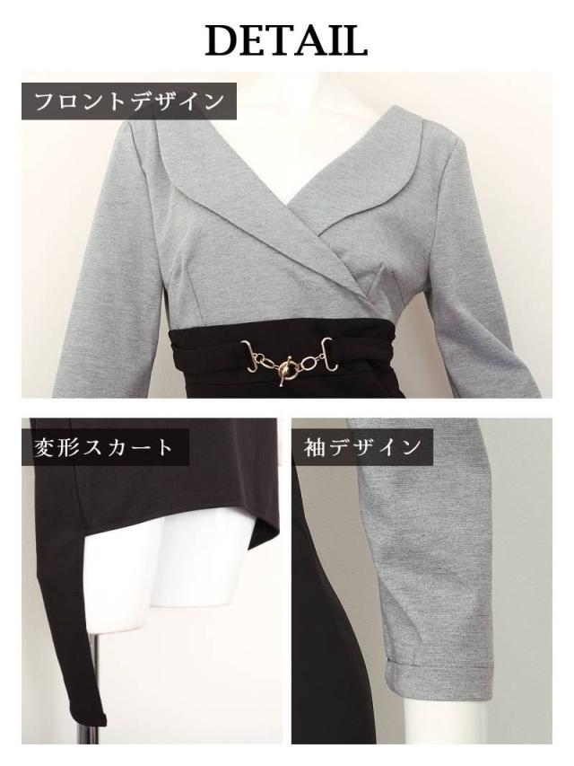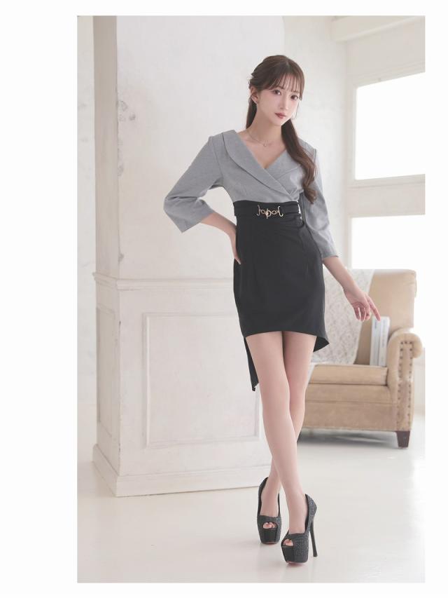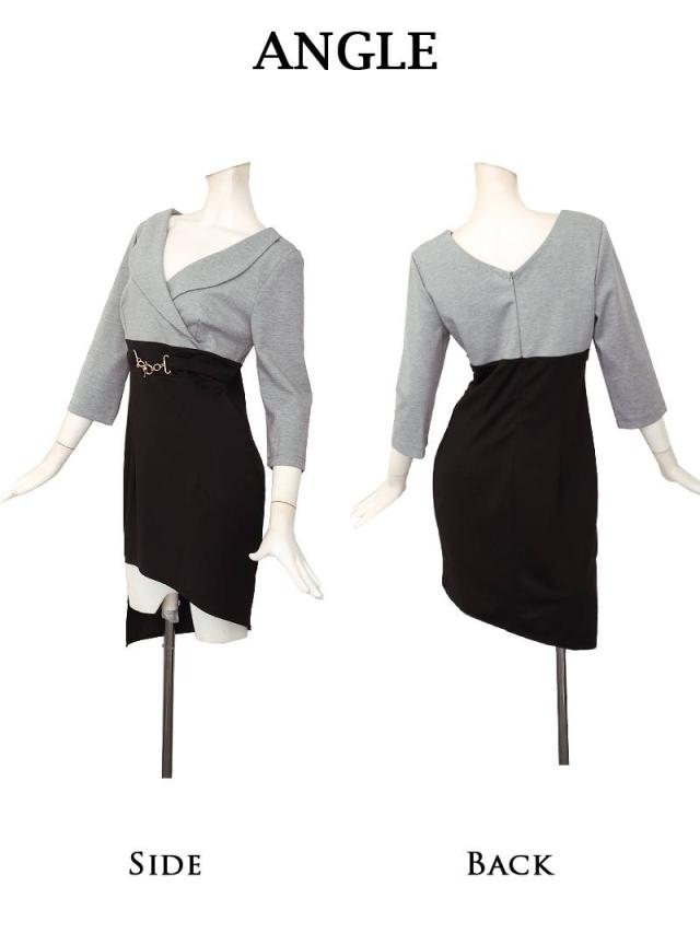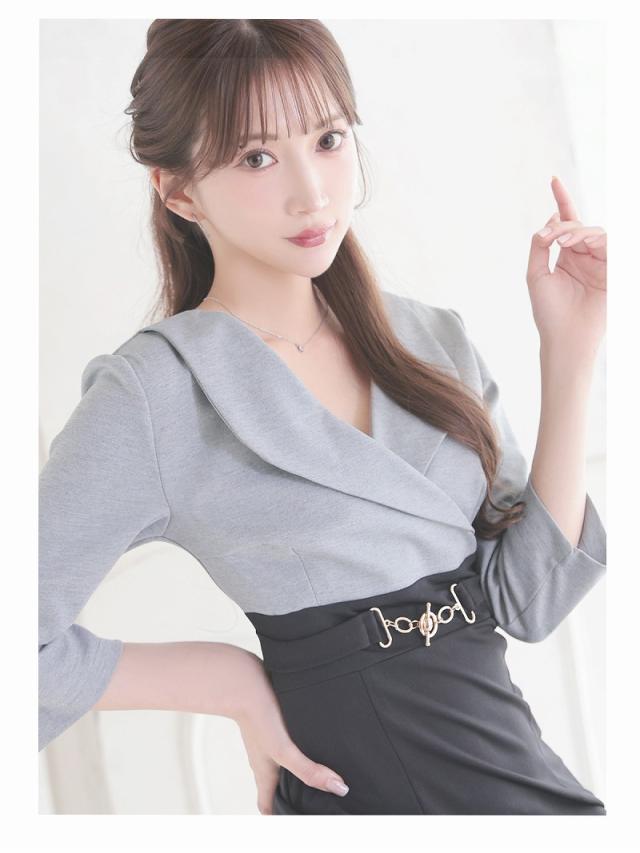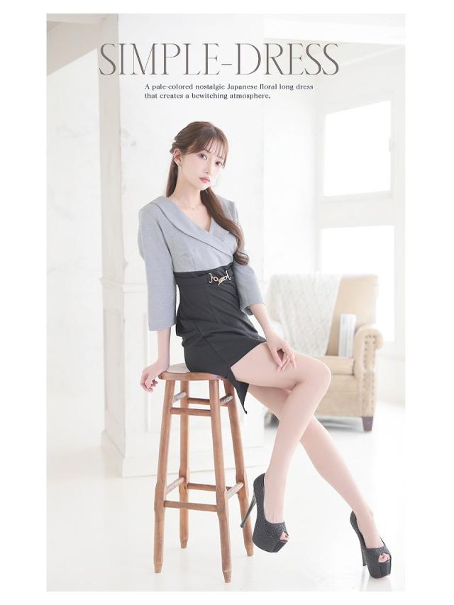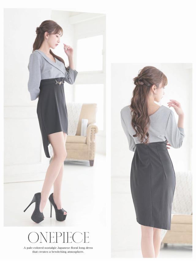ミニドレス Ryuyu バイカラー グレー 袖付き 谷間 襟付き キャバ ドレス キャバドレス ミニドレス ミニ キャバクラド