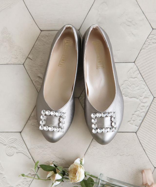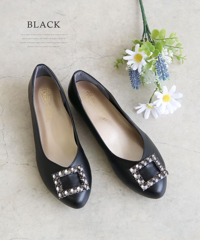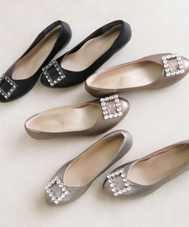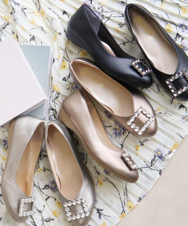 足の形が綺麗に見えるアーモンドトゥに、大きなビジューを使用したバックルデザインが上品な足元を演出します。