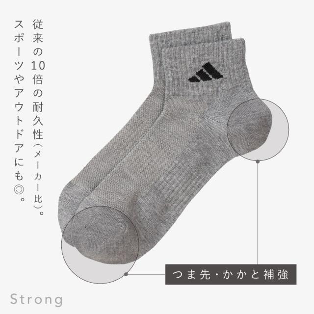 耐久性10倍(メーカー比)のアディダスのストロングソックス。破れにくく、活発に動くスポーツにもおすすめ。甲側は通気性の良いメッシュ素材で、ムレやすい季節にも◎。