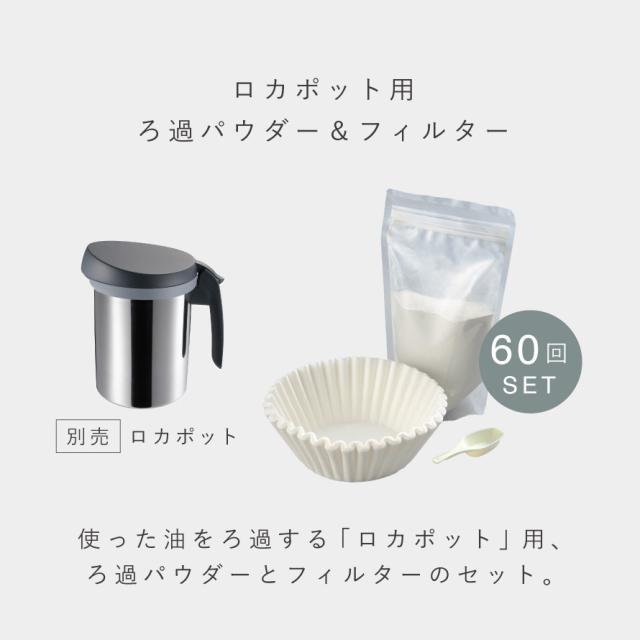 使った油をろ過する「ロカポット」でお使いいただける、ろ過パウダーとフィルターのセット(60回分)です。 ろ過パウダーとフィルターは消耗品なので、セットされているものがなくなったら、こちらをどうぞ。