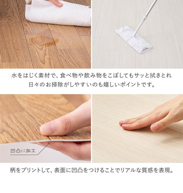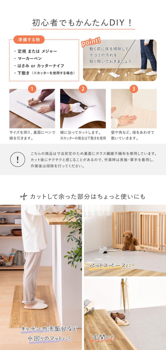 敷くだけで簡単に床の色を変えられるクッションフロア。お部屋の雰囲気がガラリと変えられるので気軽に模様替えができ、床への傷や汚れ防止にも!1枚の幅が約91cmずつにカットされているので扱いやすく、つなぎ合わせて敷き詰めるだけなので設置も簡単。やわらかい素材でカットしやすく、スペースにあわせてお使いいただけます。