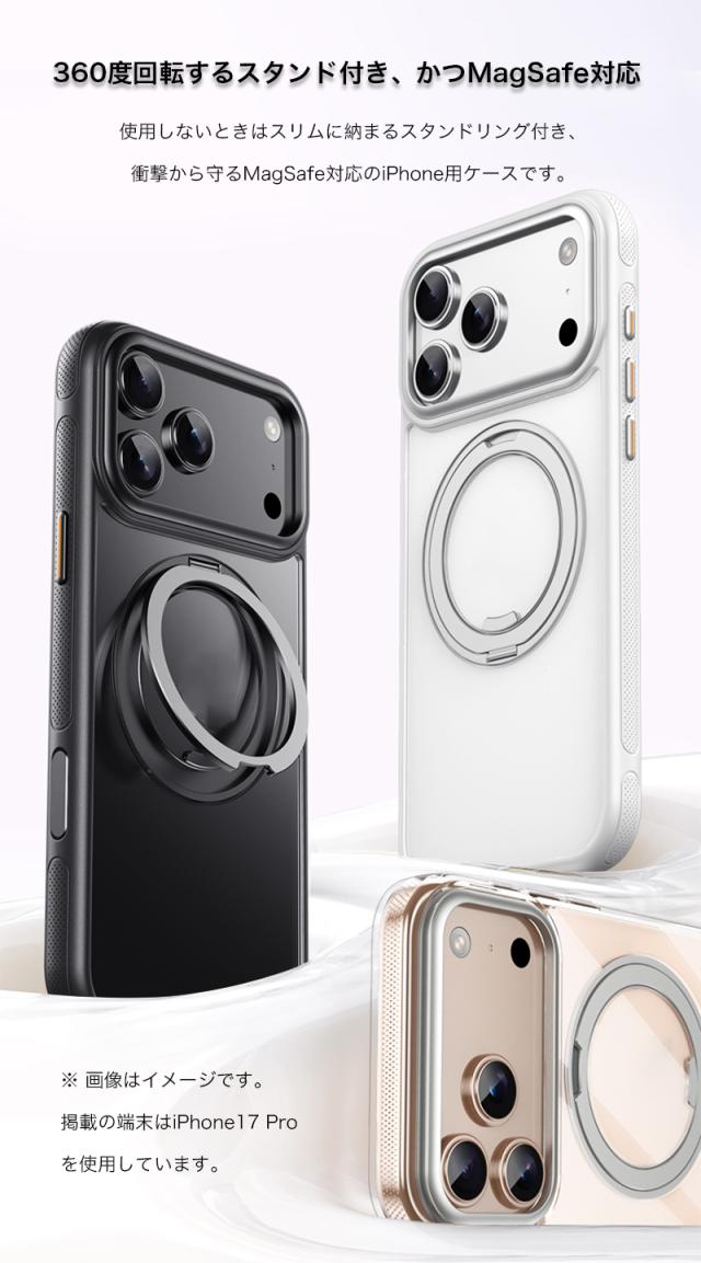 使用しないときはスリムに納まるスタンドリング付き、衝撃から守るMagSafe対応のiPhone用ケースです。