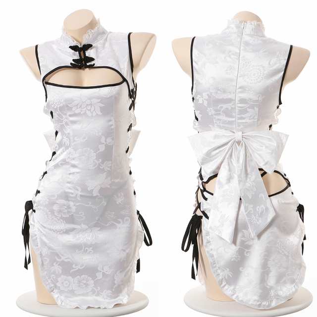 チャイナ チャイナドレス セクシー コスプレ エロ 過激 エッチ チャイナ服 ランジェリー 下着 ワンピース コスチューム ロング スリット ドレス 可愛い かわいい 穴あき レディース 衣装 仮装 ミニスカート Tバック付き セット フリーサイズ ホワイト