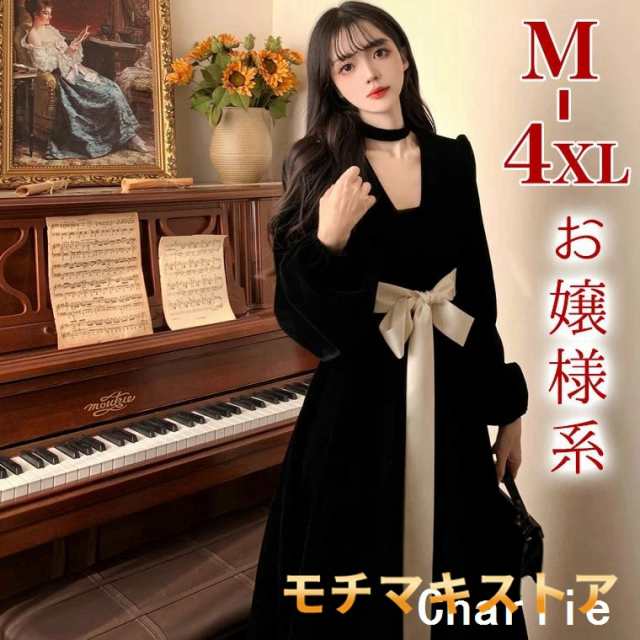 M-4Lサイズ 清楚イメージ ワンピース ゴスロリ クラシック クラシカル リボン ベルト ハイウエスト リボンタイ ふんわり袖 パフスリーブ お嬢様 ロリータ 可愛い レース リボンレース パーティー アイドル 大きいサイズ