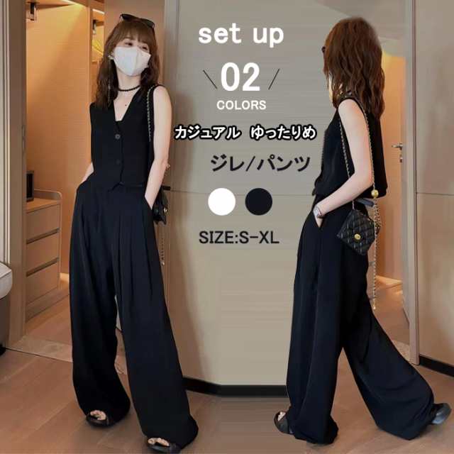 セットアップ レディース パンツスーツ ノースリーブ ジレ 春夏 夏 無地 女の子卒業式 ガウチョパンツ ベスト キャミソール ワイドパンツ 体型カバー ゆったり ハイウエスト 脚長効果 着?せ フォーマル 通勤 OL 大きいサイズ 大人可愛い 小薫風