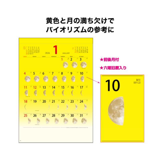 カレンダー 2026年 壁掛け ラッキームーン NK465 2026年版 カレンダー 壁掛け 月 満月 満ち欠け 月表 黄金の月 イラスト 絵入り文字 コンパクト デザイン スケジュール メモ欄 前後月表示 A/4切 257834
