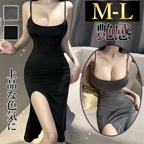 セクシーランジェリー 超過激 ベビードール 艶 サテン さらさら ワンピース 上品 スリット ブラック グレー ひざ丈 ルーム 下着 フリーサイズ ネグリジェ 過激 セクシー ルームウェア 部屋着 ドレス Tバック付き セット 抜け感