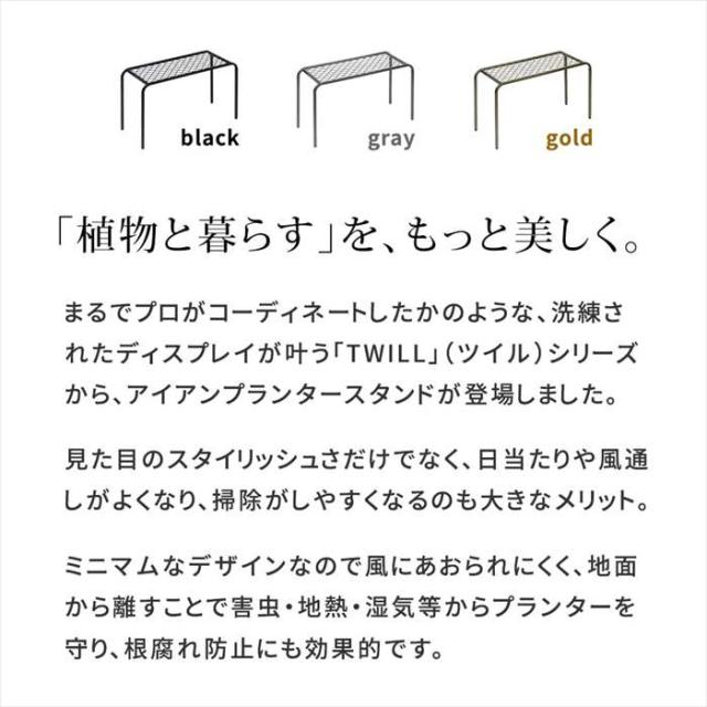 「植物と暮らす」を、もっと美しくまるでプロがコーディネートしたかのような洗練されたディスレイが叶う「TWILL」(ツイル)シリーズから、アイアンプランタースタンドが登場しました。見た目のスタイリッシュさだけでなく、日当たりや風通しがよくなり、掃除がしやすくなるのも大きなメリット。ミニマムなデザインなので風にあおられにくく、地面から離すことで害虫・地熱・湿気等からプランターを守り、根腐れ防止にも効果的。●お気に入りの植物が、まるでアートに。角の丸みがスチールの硬質さにやわらかな印象をプラス。玄関先のシューズラックや、お店の什器としても。幅や高さの違うスタンドを組み合わせることで立体感のある演出が可能。●通気性、排水性、日当たり良好。高さを出すことで、より多くの日差しを浴びられるように。植物たちが喜んでいるようで、さらに愛着が湧きそう。●室内・屋外どちらでも使えるタフな素材。頑丈で耐久性に優れたアイアン素材。さらに粉体塗装を施すことで傷や錆に強いのが特徴。