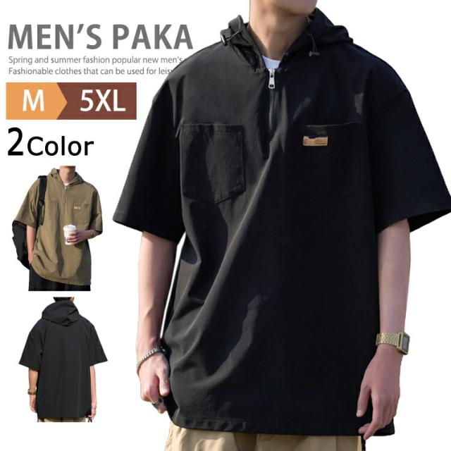 プルオーバー ナイロン パーカー メンズ 大きいサイズ ハーフジップパーカー 半袖 薄手 無地 プルパーカー スポーツ フード付きtシャツ ジップパーカー ゴルフウェア 半袖パーカー ビッグシルエット トップス キャンプ ダンス シャツ 父の日 普段着 春 夏