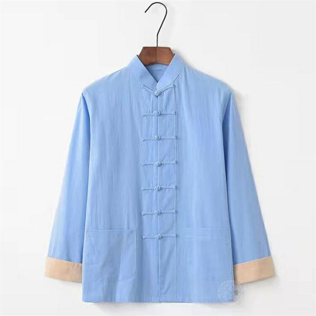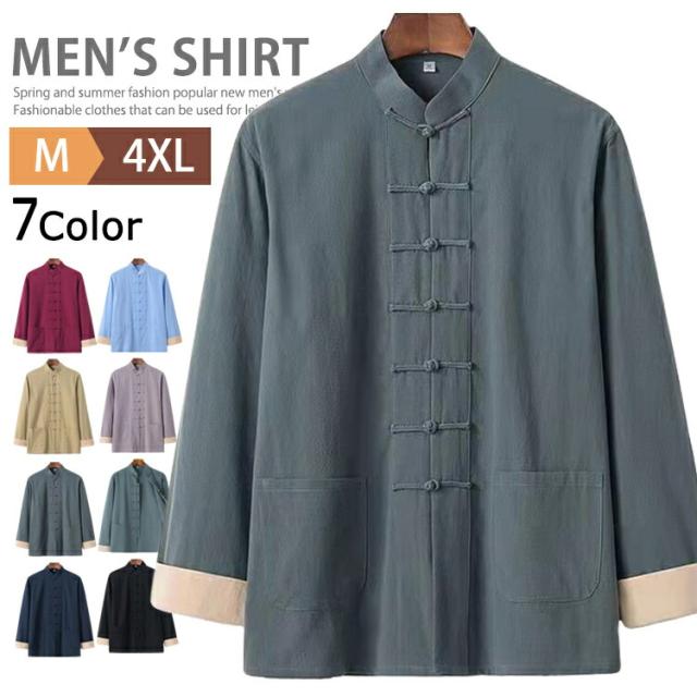 シャツ カジュアルシャツ メンズ 長袖 綿麻 チャイナ風 チャイナシャツ カンフーシャツ 唐装 漢服 スタンドカラーシャツ チャイナボタン カジュアル 普段着 部屋着 長袖シャツ 太極拳服 中華風 中華服 演出服 カジュアルコーデ 男性 無地 秋物 春物