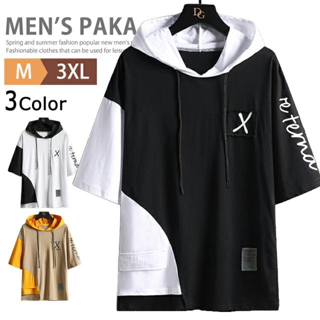 メンズ 薄手 パーカー おしゃれ 半袖パーカー 夏パーカー 綿100% プルオーバーパーカー サマーパーカー コットンパーカー プルパーカー フード付きtシャツ アウター ビジネス カジュアル フーディー トップス 切り替え 作業服 作業用 夏春 父の日