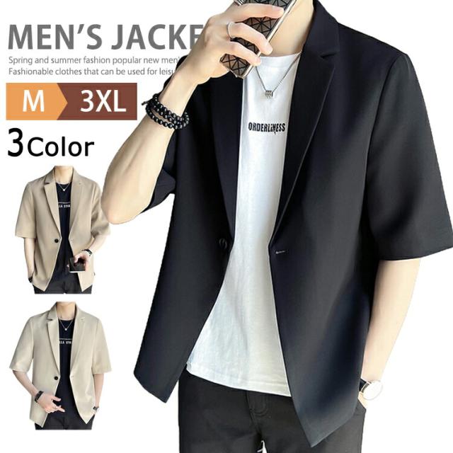 テーラードジャケット メンズ 春 夏 無地 半袖 五分袖ジャケット サマージャケット ブレザー テーラード ジャケット アウター ビジネス ビジカジ 1ツボタン 冷感 涼しい 羽織り カジュアル カーディガン フォーマル オフィス スリム 薄手 無地 父の日
