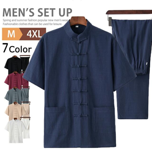 綿麻 チャイナ服 メンズ 上下セット セットアップ 半袖 綿麻 男性用 カジュアル チャイナシャツ カンフーシャツ ロングパンツ チャイナボタン ルームウェア チャイナ風 コスプレ ダンス 衣装 無地 普段着 部屋着 中華風 太極拳 唐装 演舞服 春夏 父の日