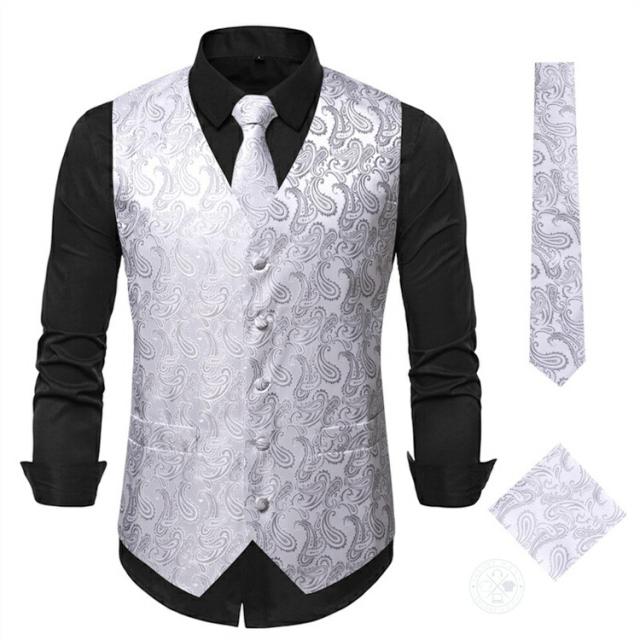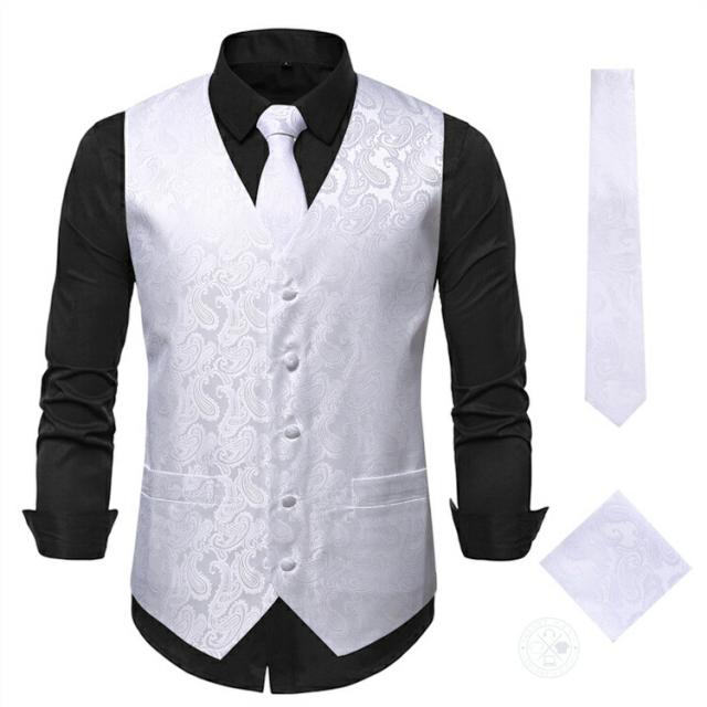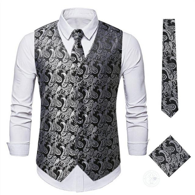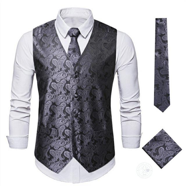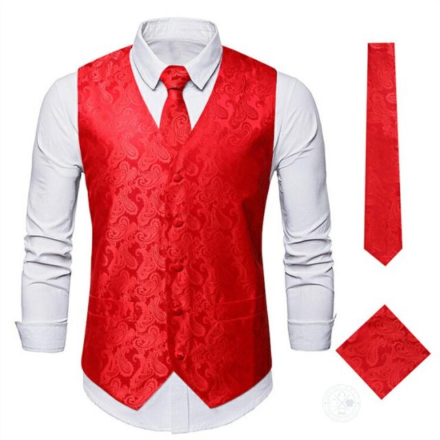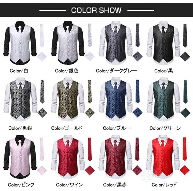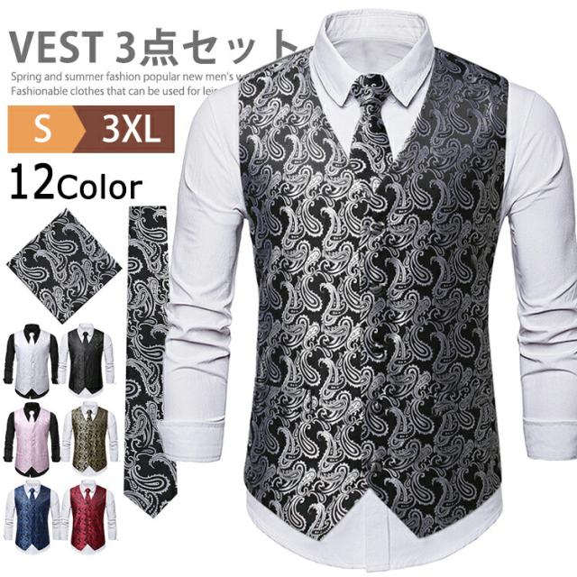 ベスト ネクタイ ポケットチーフ 3点セット 結婚式 ジレベスト カジュアル フォーマルベスト チョッキ 5ツボタン 前開き 総柄 キレイ目 ビジネス スーツベスト スリム おしゃれ ゴルフ ウエディング 披露宴 二次会 ダンス パーティ 父の日 敬老の日