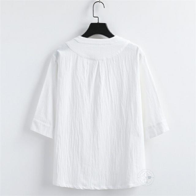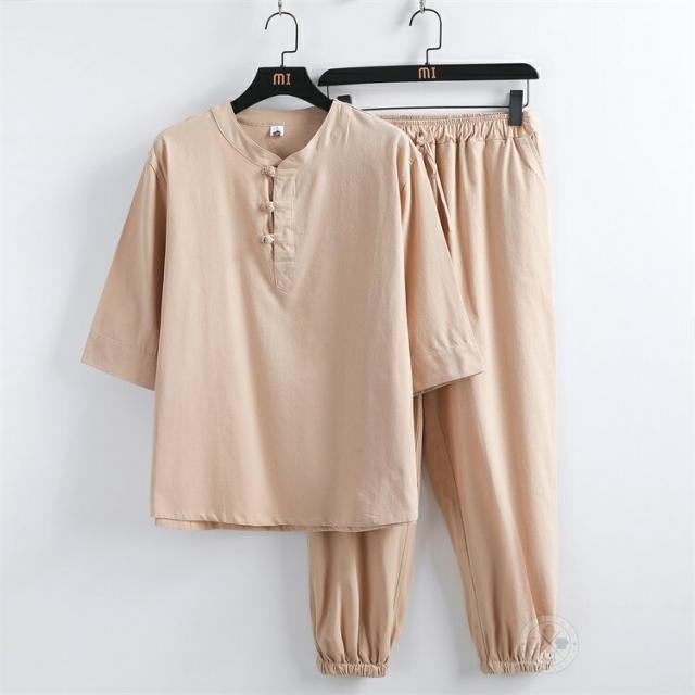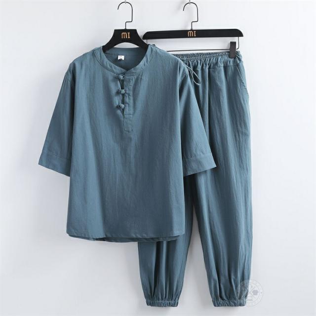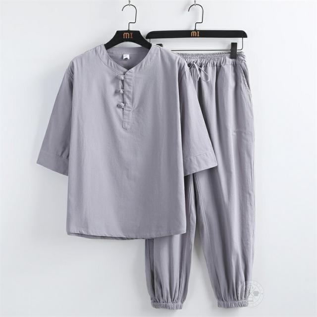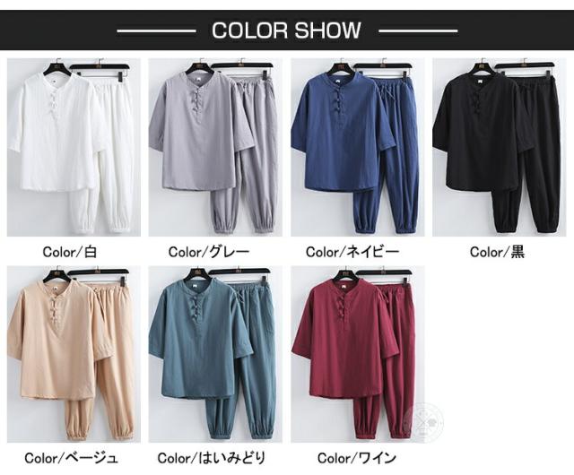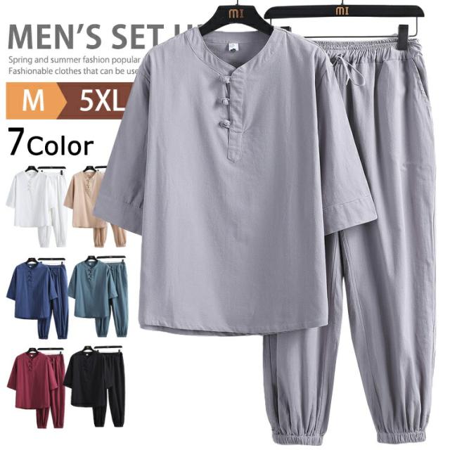 上下セット メンズ 7分袖 シャツパジャマ セットアップ ヘンリーネック リネンTシャツ ロングパンツ ゆったり カジュアルセット 2点セット ダンス チャイナ服 チャイナ風 ルームウエア 大きいサイズ ストリート系 部屋着 薄手 春夏 服 凉しい 父の日