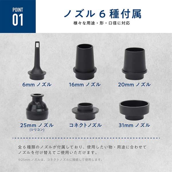 | セット内容 | 本体 収納袋 USBコード 31mmノズル 25mmノズル 20mmノズル 16mmノズル 6mmノズル コネクトノズル |