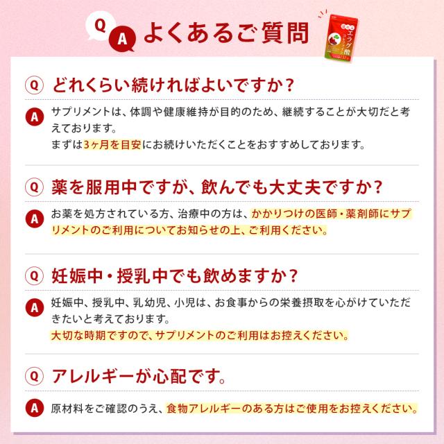 | 原材料名 | ザクロ抽出物(インド製造)、米麹(米、麹菌)、アフリカマンゴノキエキス、ブラックジンジャーエキス末(澱粉、ブラックジンジャー抽出物)/HPMC、ステアリン酸Ca、着色料(炭酸カルシウム) |