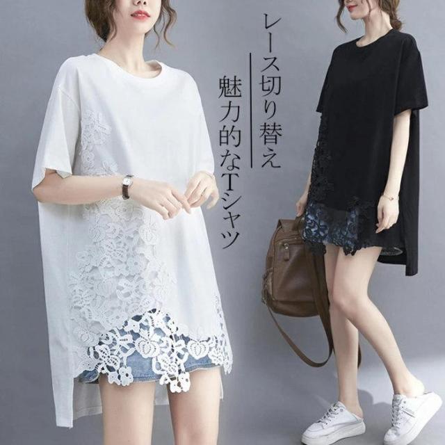 フラワーレース チュニック ワンピース チュニック レディース 半袖 夏 レース切り替え tシャツ オーバーサイズ tシャツ ロング ドッキングトップス