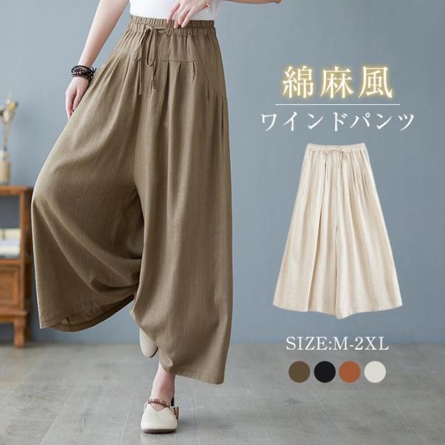 ワイドパンツ パンツ レディース 40代 春夏 綿麻 ボトムス ロングパンツ 韓国風 おしゃれ コットンリネン 体型カバー ウエストゴム ゆったり 楽ちん