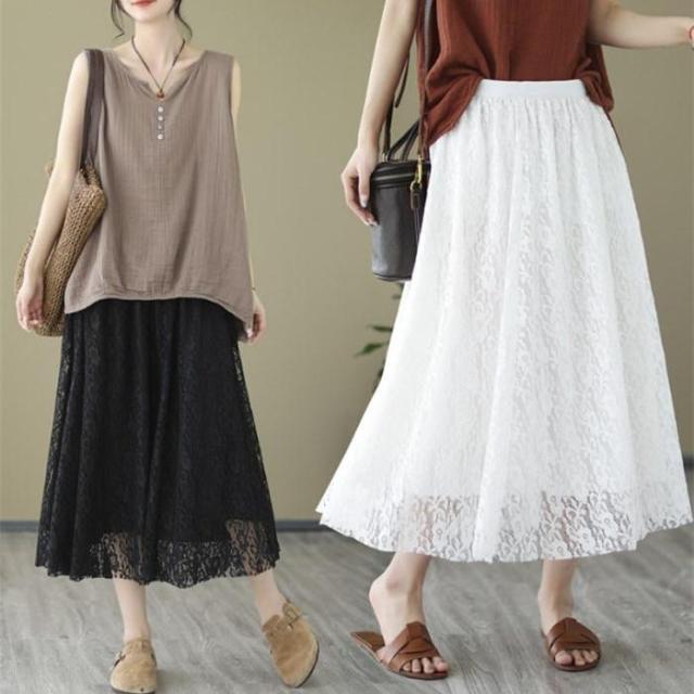 スカート レーススカート Aライン 総レース スカート レディース ロング ボトムス スカート プリーツスカートスカラップ チュール ウエストゴム 裏地付き