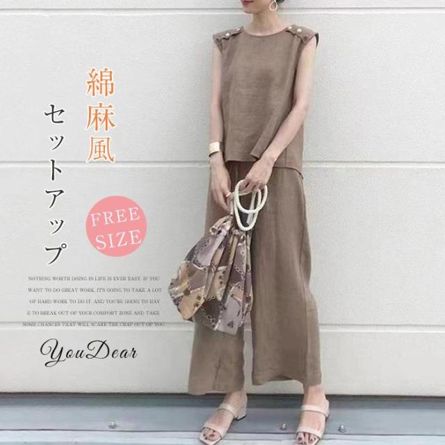 セットアップ レディース 夏 春 Tシャツ ブラウス 袖なし ノースリーブ カジュアル ワイドパンツ 無地 きれいめ ロングパンツ 体型カバー 着痩せ