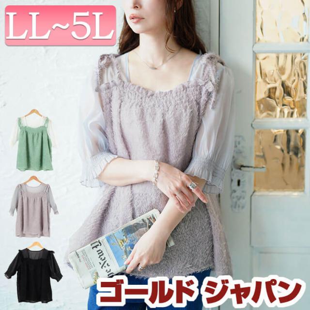 春新作 大きいサイズ レディース チュニック フリンジキャミドッキングチュニック ドッキング キャミ シアー 透け感 パフスリーブ フリンジ シャギー 5分袖 フレア 切り替え リボン ゆったり 夏服 秋服 春服 LL 2L 3L 4L 5L ブラック 黒 グレー グリーン ゴールドジャパン