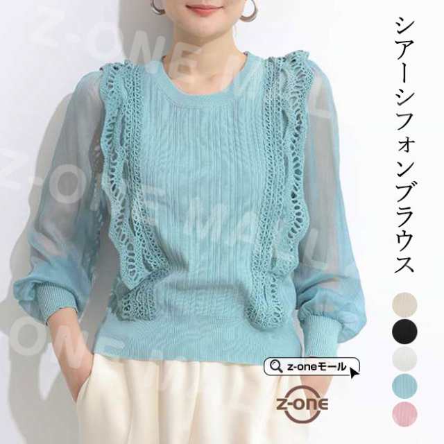 シアーシフォンブラウス 夏新作 送料無料 レース 透け感 バルーンスリーブ トップス レディース プルオーバー Uネック シースルー ラウンドネック ブラウス 長袖 七夕プレゼント