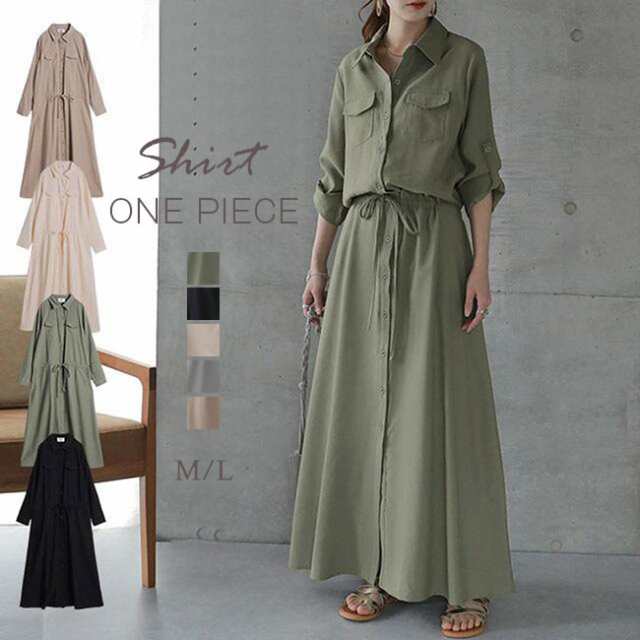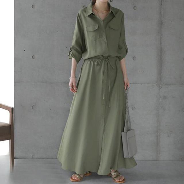 7分袖 長袖 ロングワンピース 夏新作 ポリエステル シャツワンピース Vネック レディース 膝上 着痩せ きれいめ ゆったり 体型カバー 春 夏 ロング丈 無地 七夕プレゼント
