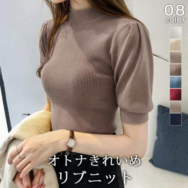 サマーニット パワショル ニット トップス レディース リブニット 半袖 五分袖 タートルネック ハイネック パフスリーブ 無地 オフィスカジュアル 上品 きれいめ 二の腕 カバー 首元 隠し uv 紫外線対策 七夕プレゼント