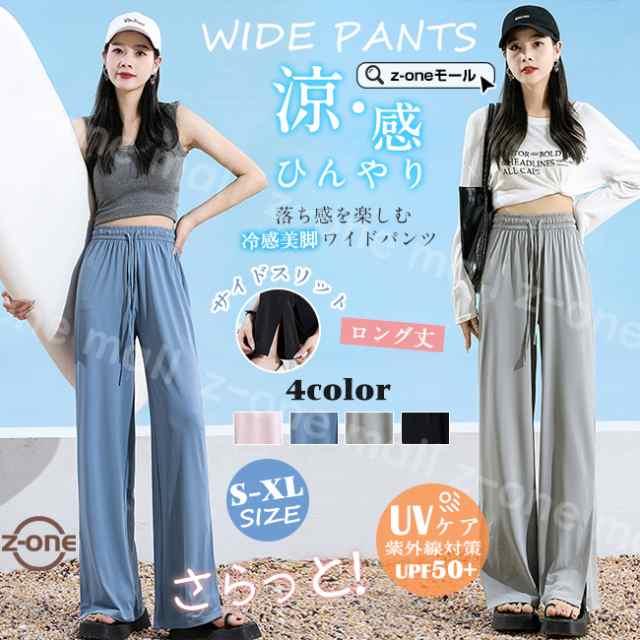 ワイドパンツ 夏新作 送料無料 パンツ ガウチョ ひんやり 接触冷感 涼感 ロング丈 サイドスリット 夏対策 UVカット 紫外線対策 日よけ レディース 薄手 体型カバー ハイウエスト ゆったり ゴム オシャレ 七夕プレゼント