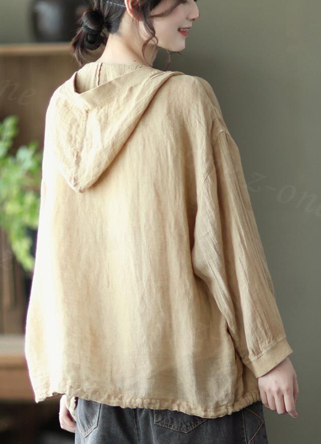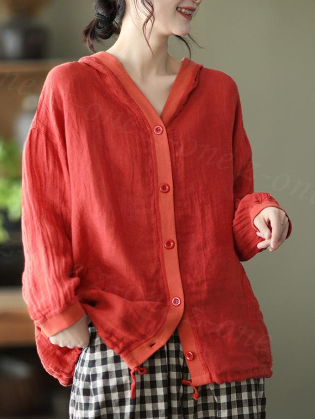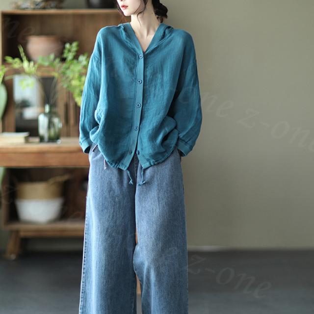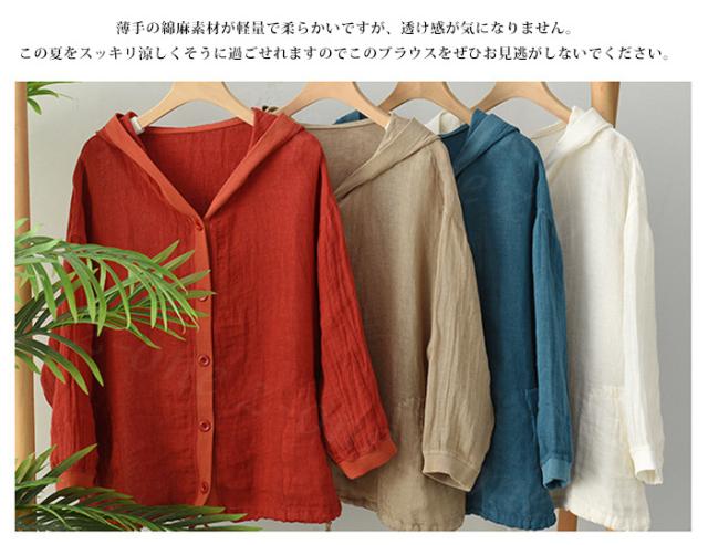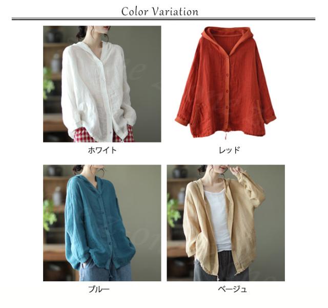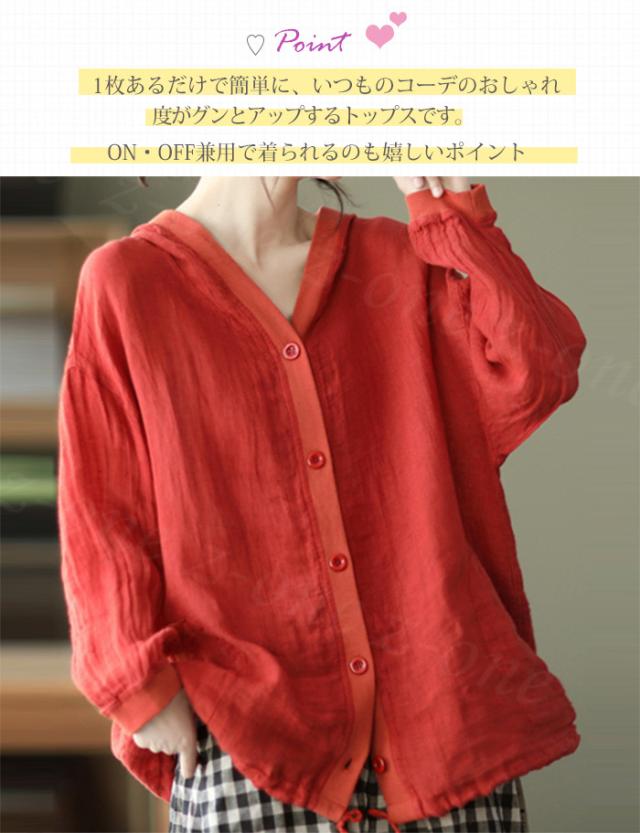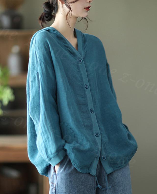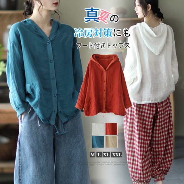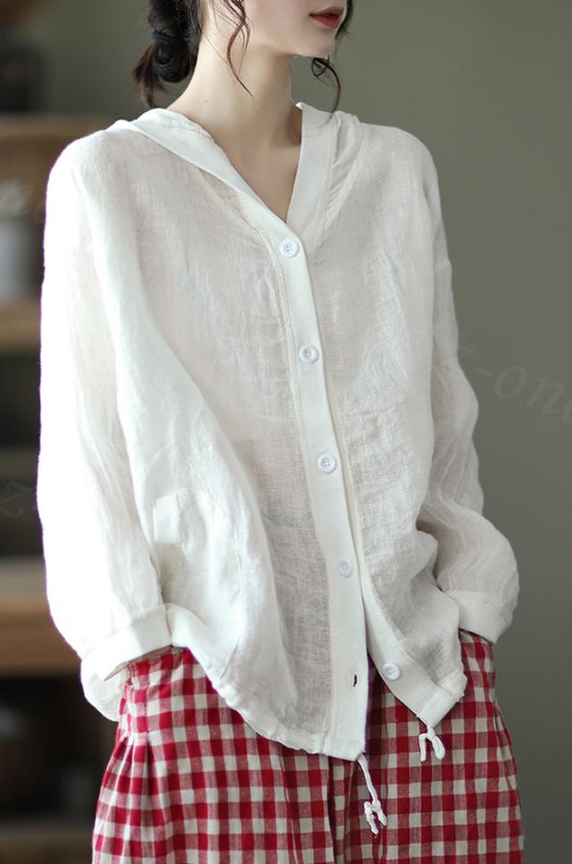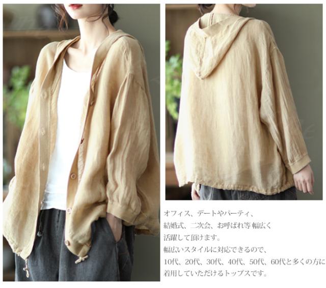 リネン トップス レディース シャツ 長袖 ブラウス 綿麻 パーカー 夏新作 フード付き ゆったり 前開きアウター トレーナー 上着 シャツ 無地 スウェット 体型カバー 着やせ トップス レディース ゆったり 七夕プレゼント