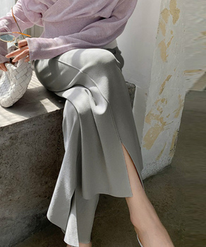 前裾にスリットが入っており、足首をすっきりと見せてくれ、軽やかに穿けて女性らしさを引き立てる