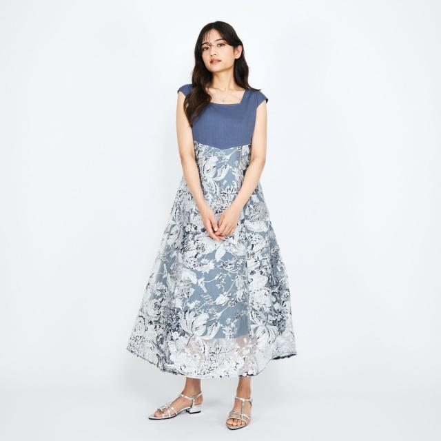 細かに編み込んだニットのような変形テレコ素材を上半身に、スカート部分はオパール加工を施した大柄のボタニカルプリントのテキスタイルをレイヤリングしたドッキングワンピースです。