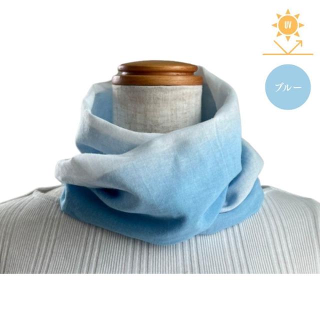 首周りを紫外線から守るスカーフ。誰でも簡単に巻けるように、首の後ろにあるマジックテープを留めるだけでふんわりオシャレにまとまります。