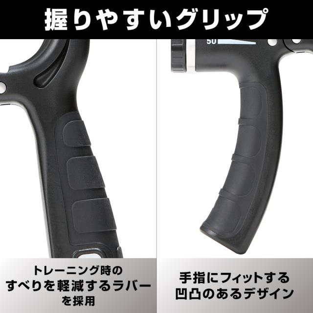 最大50kgまで自由に負荷調整可能な「ハンドグリップ」。滑りにくく握りやすい設計で、手にしっかりフィットします。