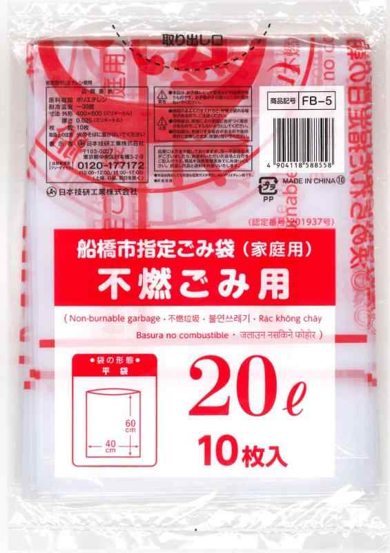 [日本技研工業] 船橋市 指定ゴミ袋 (不燃ごみ・家庭用) FB-5 半透明 20L 10枚入り