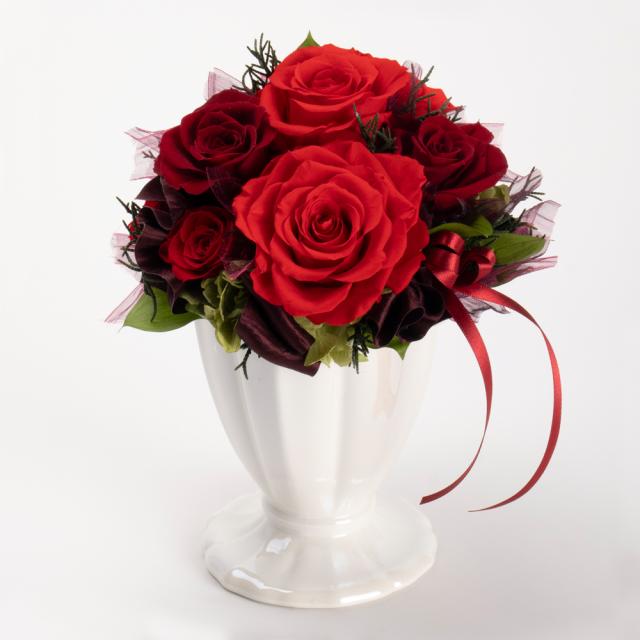 赤バラとリボンが華やかなプリザーブドフラワーアレンジメントです。