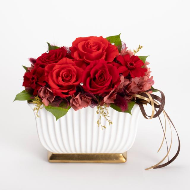 赤バラとリボンが華やかなプリザーブドフラワーアレンジメントです。