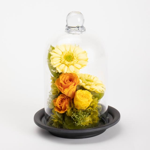 プラスティックのボトル型カバーがついたプリザーブドフラワーアレンジメントです。